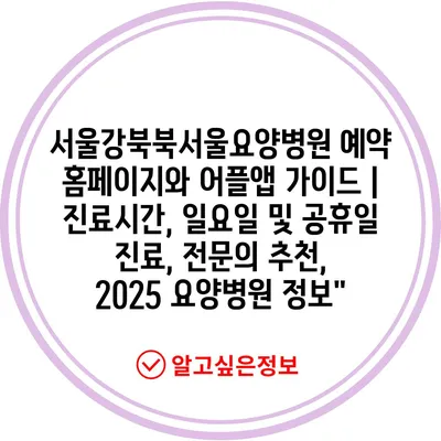 서울강북북서울요양병원 예약 홈페이지와 어플앱 설명서 | 진료시간, 일요일 및 공휴일 진료, 전연락 추천, 2025 요양병원 정보 에 대해 자주 묻는 질문 TOP 5
