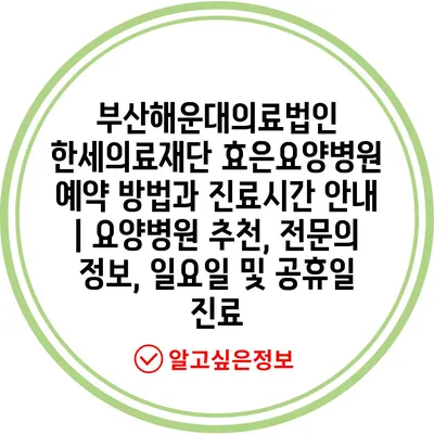 부산해운대의료법인 한세의료재단 효은요양병원 예약 방법과 진료시간 공지 | 요양병원 추천, 전연락 정보, 일요일 및 공휴일 진료 에 대해 자주 묻는 질문 TOP 5